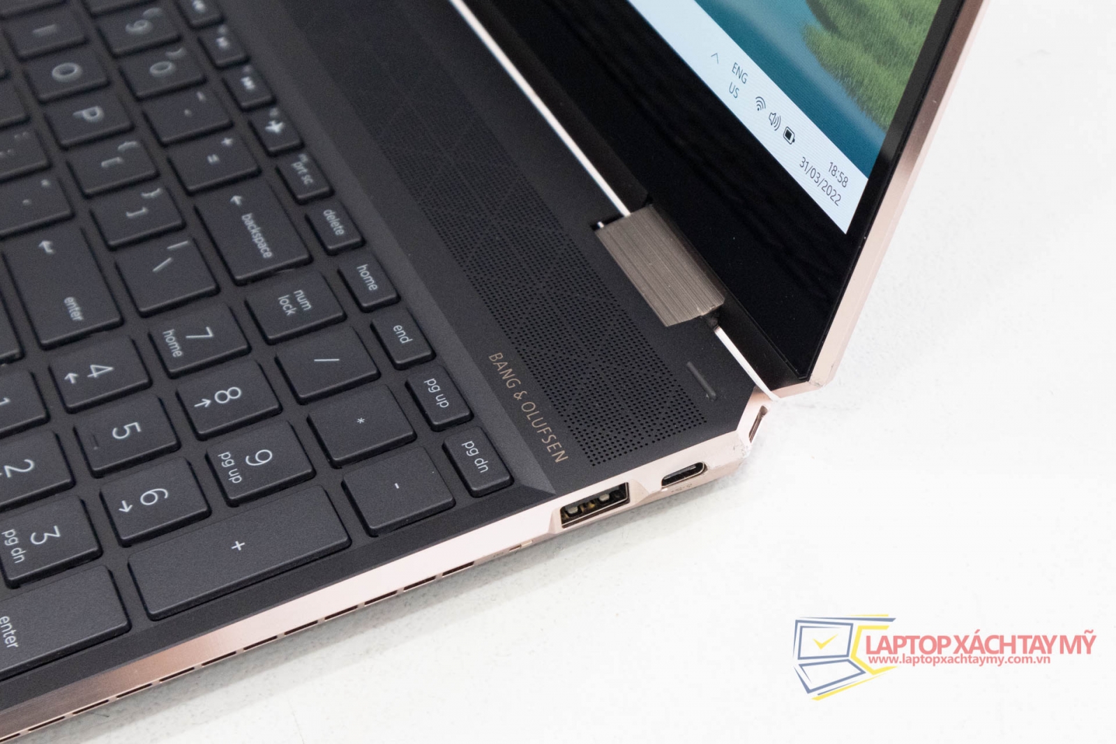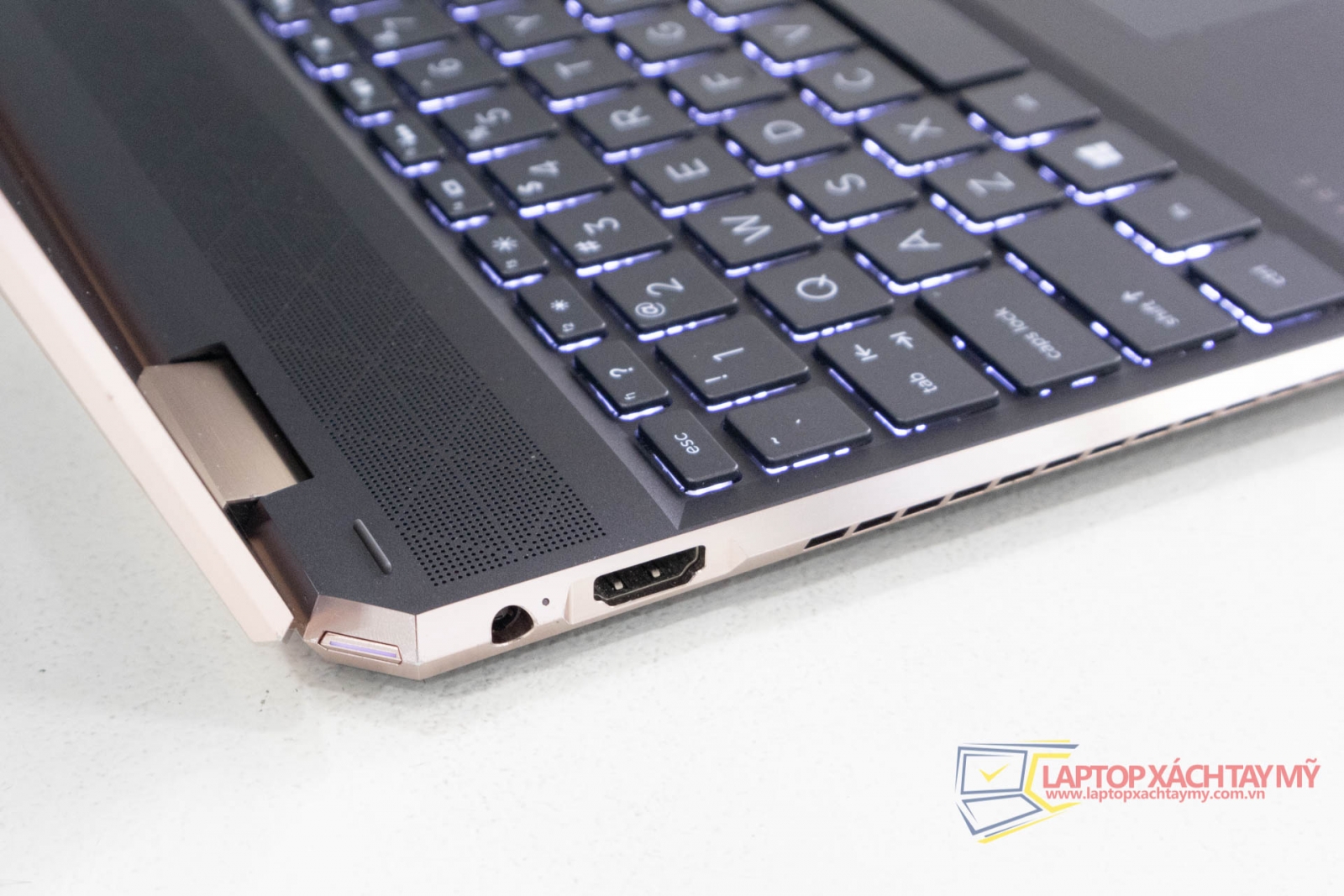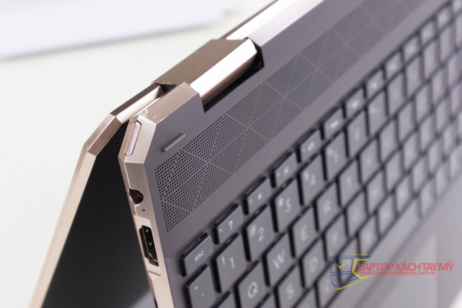 Khi bạn nhìn vào cạnh trái của HP Spectre x360 15, bạn sẽ thấy giắc cắm sạc, giắc USB 3.1 kích thước đầy đủ, loa ngoài, giắc cắm tai nghe 3,5 mm, giắc USB-C và giắc HDMI. Ở bên phải có đầu vào Thunderbolt 3, đầu vào USB-C và đầu vào HDMI. Nó cũng bao gồm một loa loa khác, máy quét dấu vân tay và kẹp điều chỉnh âm lượng.